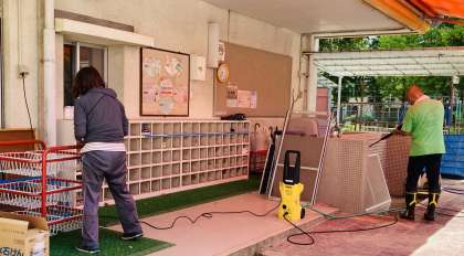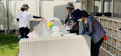 1学期に色水づくりや水遊びに使った物の手入れやプール遊びの片付けをしました。きれいに洗った後、夏休み中も使うもの、2学期に再度使うもの、来年まで使わないものに分けていきました。