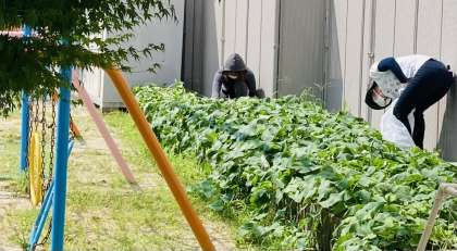 また、保育室の網戸やエアコンの掃除をしたり、栽培物の雑草抜きをしたり、協力してきれいにしました。