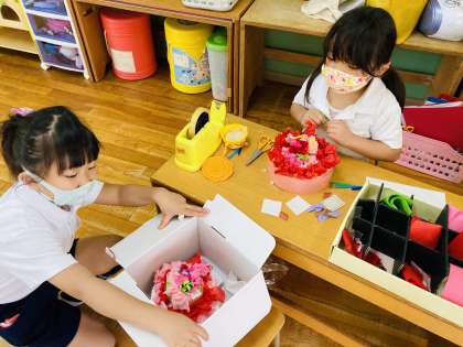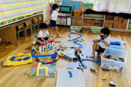 今朝は、保育室でプラレールを部屋いっぱいに並べて遊んだり、折り紙で難しい折り方に挑戦したり、紙やモールを使ってデコレーションケーキをつくって遊んだり、それぞれやりたいことを見つけてじっくりと楽しんでいました。その後、園庭で水遊びもしました。
