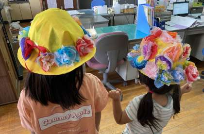 厚紙、不織布、お花紙、ホチキス、ボンド、テープなどいろいろなものを使いながら、思い思いに仕上げ、つくった帽子をかぶって職員室に見せに来てくれました。