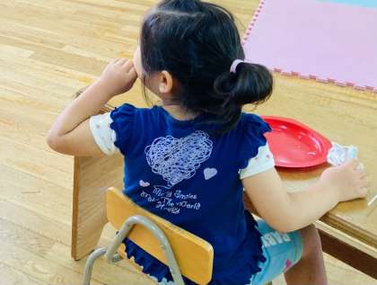 預かり保育では、おやつの時間があります。感染予防のため、隣との間隔をあけて静かに食べますが、今日も子ども同士が自然とアイコンタクトをとって嬉しそうに食べていました。