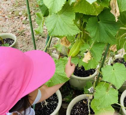 久しぶりの園庭で、子どもの腕より太いきゅうりを発見。