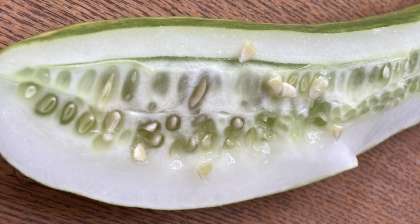 中はどうなっているのかなと気になり切ってみました。中は、種がいっぱいでいつも食べるきゅうりとは違いました。