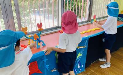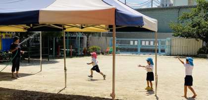 また、園庭ではホースで水をまいたら「虹が見えた」と大はしゃぎ。その後は水鉄砲で存分に遊びました。