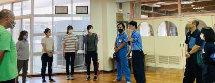 写真は訓練終了後です。訓練をするだけでなく、訓練後、留意点等を教えていただいたり、一人一人の気付きを伝え合って共有したりして意識を高めました。