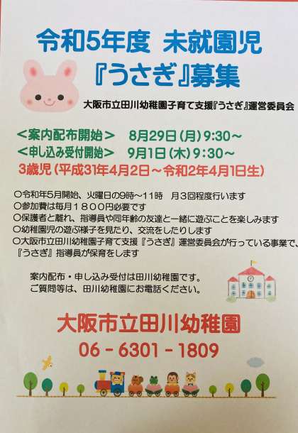明日9:30より、令和5年度『うさぎ』の申し込み受付を開始します。『うさぎ』の活動は、子育て支援『うさぎ』運営委員会が行っています。お待ちしています。