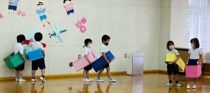 4歳児は、電車の絵本を読んだ後、手づくり電車に乗ってプレイルームにお出かけ。一人ずつ電車に乗るのも楽しいし、友達と連結するのも楽しそうでした。