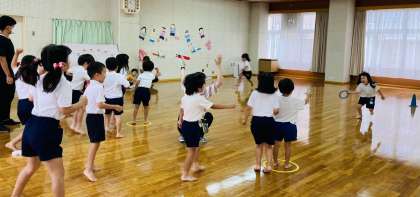 5歳児は、チーム対抗でいろいろな競争をしていました。自分が頑張るだけでなく、チームの仲間を応援する声がたくさん聞こえてきました。