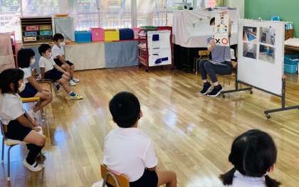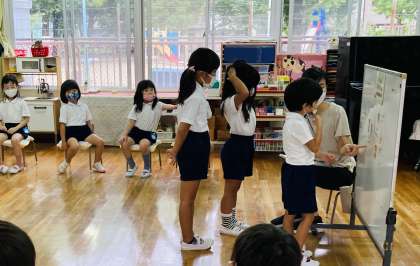 発育測定の後、安全指導を行いました。遊びに使っていた物を放置している写真や、トイレのドアを開け放したままにしている写真など、ケガにつながる可能性がある状況の写真を見せながら、どこが危ないか、どのように改善したらよいか、子どもたち自身が気付き、意識していけるよう、子どもに問いかけたり知らせたりしました。