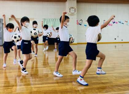 サッカーボールを持って入場する時にどんな風に歩いたらかっこいいか、みんなで考えていました。2チームで交代で歩いて、友達のがんばっているところをたくさん見つけ伝え合いました。頑張るポイントもわかり、活動の最後には、クラス全員で腕を高らかにあげて自信をもって歩く姿が見られました。