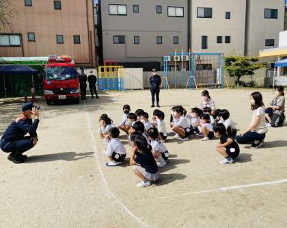 火災の避難訓練の様子を消防士さんが見に来てくださいました。『お・は・し・も』の約束を守って、速やかに避難でき、褒めていただきました。