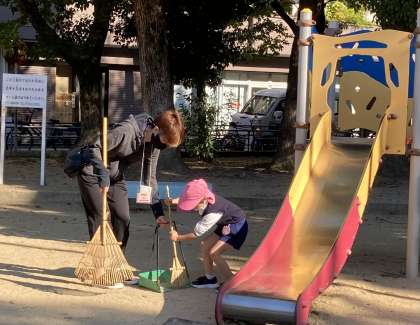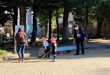幼稚園の隣の公園を保護者と一緒にきれいにしました。熊手やチリトリなどの掃除用具の使い方もだんだん慣れてきました。