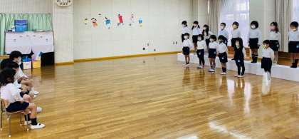 5歳児は、作品展のオープニングで歌を披露します。今日は4歳児がお客さんになって歌を聴いた後、「声がきれいだった」「かっこよかった」と5歳児に伝える姿が見られました。