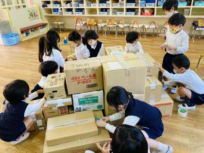 たくさんのダンボールを組み合わせ、山の形にしていきます。「高くしたいな」「階段みたいに並べたい」など友達と思いを伝え合いながら並べた後、氷に見えるように、白いポリ袋を貼っていきました。みんなで力を合わせて、素敵な氷の山ができました。