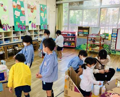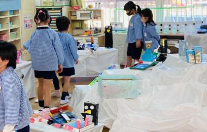 今日は、互いのクラスの作品を見合ったり、子どもたちと飾り方を考えたりしました。みんなの作品が素敵に見えるように、そして見に来てくれた人も見やすいようにと考え作品を並べました。5歳児は、作品と作品の間の通り道が狭いと見る人が困ると言って、友達と一緒に通りやすくする姿も見られました。