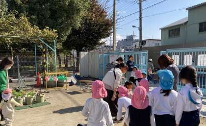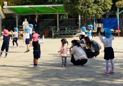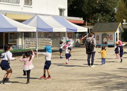 今日もポカポカいいお天気で、園庭は暑いくらいでした。地域の小さいお友達が遊びに来てくれて一緒に遊んだ後、最後に園児と一緒にどんぐりのダンスをしました。楽しかったね。また来てね。