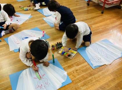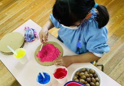 今日は、5歳児は凧づくり、4歳児は自然物と色をつけたポンドを使ってケーキづくりを楽しんでいました。