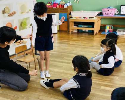 月1回実施の体重測定後に、冬野菜についての食育指導を行いました。実物の野菜や野菜の断面を大きく写した写真を見せながら、野菜を食べるといいことがあることを知らせました。長いごぼうとは背比べをして、「こんなに長いのが土の中にあるの」と驚く姿も見られました。