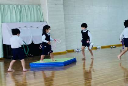 縄のしっぽをつけて、4歳児がしっぽとりをしていました。今は、先生が入り一緒に遊ぶことで、楽しさを味わっています。追いかけてほしい子、しっぽをとりたい子、一人一人楽しみ方は様々です。