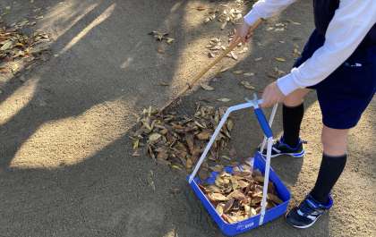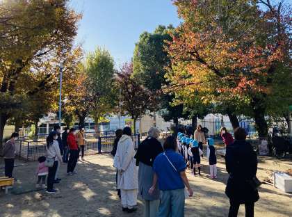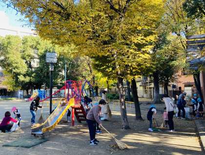 保護者と一緒に公園清掃をしました。木々が美しく色づく季節となり、落ち葉もいっぱいでした。繰り返し経験してきたことで、熊手やちりとりの使い方にも慣れてきました。