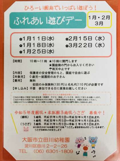 次回は1月11日(水)です。予約不要です。広い園庭で一緒に遊びましょう。お待ちしています。