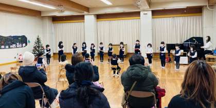 今日は、2学期最終日。終業式では、2学期にあった楽しかった出来事を振り返ったり、長い休みを元気に安全に過ごせるように3つの約束をしたりしました。また、遊びの発表をして保護者に見ていただき、うれしそうな姿や緊張している姿などが見られました。