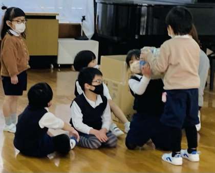 各クラス、絵本を題材に劇遊びを楽しんでいます。台本を覚えるのでなく、登場人物の気持ちになって遊ぶ中で出てきた言葉をセリフにし、動きや道具、身につける物など、先生と子どもたちで考えてつくりあげていきます。