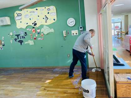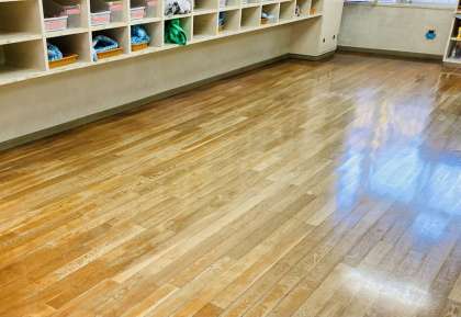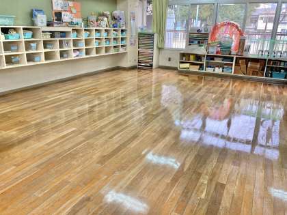 午後に、事業担当主事さんがワックスがけをしてくれました。塗って乾かしてを繰り返ししてくださり、保育室の床が鏡のようにピカピカになりました。子どもたちが安全に気持ちよく過ごせるように、廊下やプレルームも順次ワックスがけをしてくださる予定です。