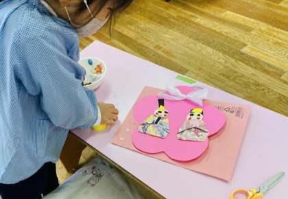 5歳児は、先日は屏風やぼんぼりをつくり、今日は人形づくりに取りかかっていました。根気よく取り組んでいます。