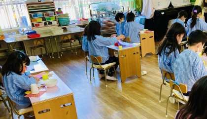 4歳児は、いつもの折り紙とは違う、和の雰囲気の千代紙の美しさにうっとり。顔の細かいパーツもハサミで切ってつくっていました。
