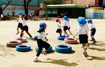 最近、園庭ではタイヤを丸く並べて椅子取りゲームのような遊びを楽しむ姿が見られます。子どもたちが今年幼稚園で歌ったいろいろな歌を歌いながら、タイヤの周りを走り、歌の終わりでタイヤを見つけて座ります。今日も、いろいろな歌を歌いながら繰り返し楽しんでいました。