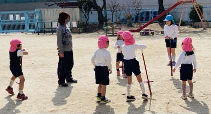 また、先週から使い始めたホッピングを100回も連続して跳べるようになった5歳児を4歳児が憧れの目で見つめる姿もありました。