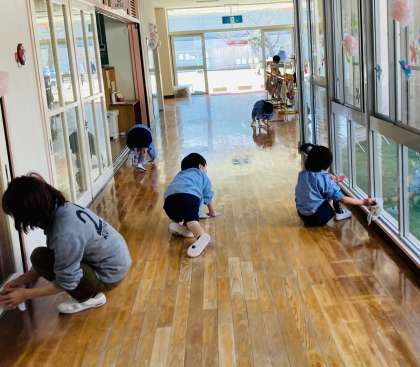 明日、大きい組さんが修了式だからきれいにしたいと、4歳児が廊下をピカピカに雑巾かけをしたり、いろいろなところの拭き掃除をしたりしていました。
