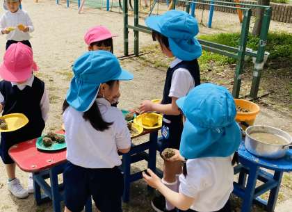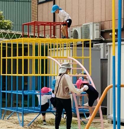 今日は、5歳児そら組を追いかけてジャングルジムに登ったり、5歳児が泥団子を並べてお店屋さんごっこをしているところを覗いたりして楽しんでいました。
