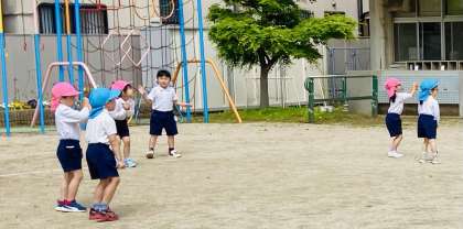 田川幼稚園では、異年齢交流活動を子どもたちがミックスジュースの日と名付け、学年が違う友達との関わりも深めていけるように取り組んでいます。