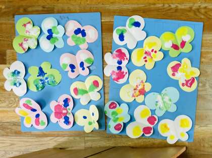 4歳児が、ちょうちょの形の画用紙に絵の具を垂らして半分に折り、おまじないをかけると、きれいな模様のちょうちょに変身。画用紙を広げる瞬間、「わあっ!」と喜びの声が聞こえてきました。