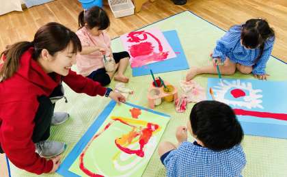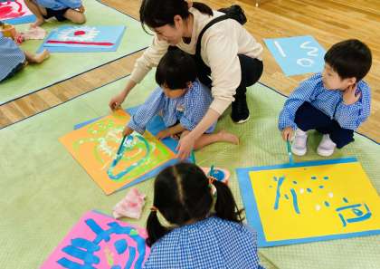 入園してから、いろいろな絵の具遊びを楽しんできた4歳児が、今日は、筆を使ってかくことを楽しんでいました。