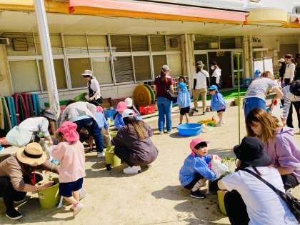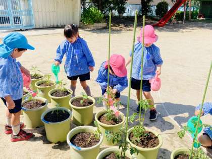 登園後に、夏野菜の苗を保護者と一緒に植えました。これから毎日お世話をして、おいしいピーマン、ミニトマト、オクラができますように。楽しみですね。