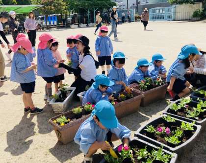 夏野菜の後は、子どもたちと教職員で花の苗も植えました。5歳児がしているのを見て、4歳児もやりたくなったようで、みんなで楽しみながら植えました。