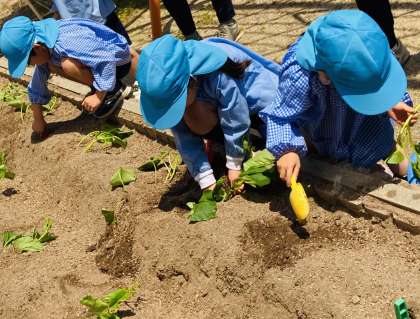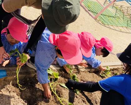 今日は、園庭の畑にサツマイモの苗を植えました。苗だけれど、昨日植えた夏野菜や花の苗とは、全く違います。
