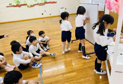 今日は、田川幼稚園の創立記念日です。子どもたちみんなで、ケーキに飾り付けをしたり、誕生日の歌を歌ったりしてお祝いしました。