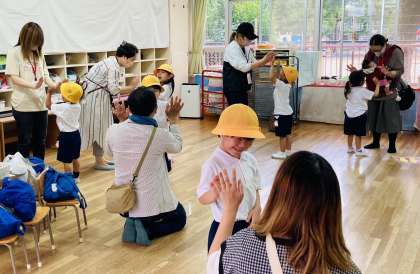 担任からの話の後は、その月の誕生児が遊びの発表をしたり、クラスで取り組んでいる遊びを見てもらったり、保護者と一緒に日頃楽しんでいるふれあい遊びをしたりしました。