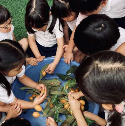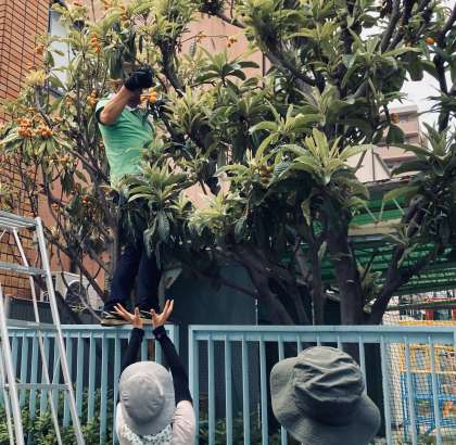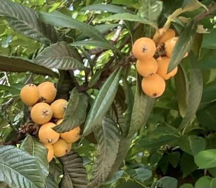 今年は、園庭のびわがたくさん実り、おいしそうな色に色付いてきたので、今日収穫しました。