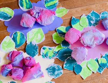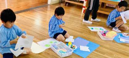 真ん中の部分は、にじみ絵をして、乾かした紙を使って立体的につくりました。葉っぱは、実物を取ってきて絵の具でスタンプしたものを、乾かしてからハサミで丁寧に切りました。