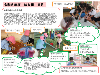 段々と暑くなって水が恋しくなる今の時期ならではの遊びを楽しみ、感触を味わったり、試したりして遊びました。感じたこと、気付いたこと、自分なりに考えたことを、友達や教師に伝えたり、取り入れて一緒に工夫したりする姿が見られるようになってきました。