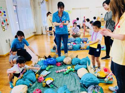 楽しい遊びがいろいろあり、前半は、5歳児と4歳児が異年齢ペアで遊びのコーナーをまわり存分に楽しんでいました。