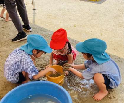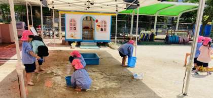 今日は、テント下の日陰で水でっぽうをしたり、泥んこ遊びをしたりしました。