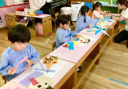5歳児は、紙を編み込む活動の後にキラキラうろこをつけて魚をつくっていました。4歳児は、紙を切り貼りして顔をつくっていました。