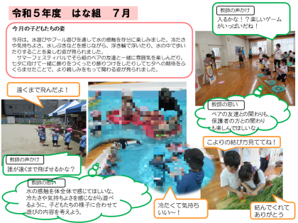 園庭での水遊びやプール遊びを通して、存分に水に触れて、関わって遊びました。そら組は、自分なりに水に関わることを楽しむようになり、その姿に刺激を受けたはな組は、水に親しんで遊ぶようになりました。