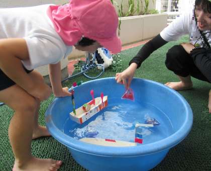 遊んでいるうちに、船に水が入ってしまうと沈むことが分かり、水が入らないように動かして遊んでいました。